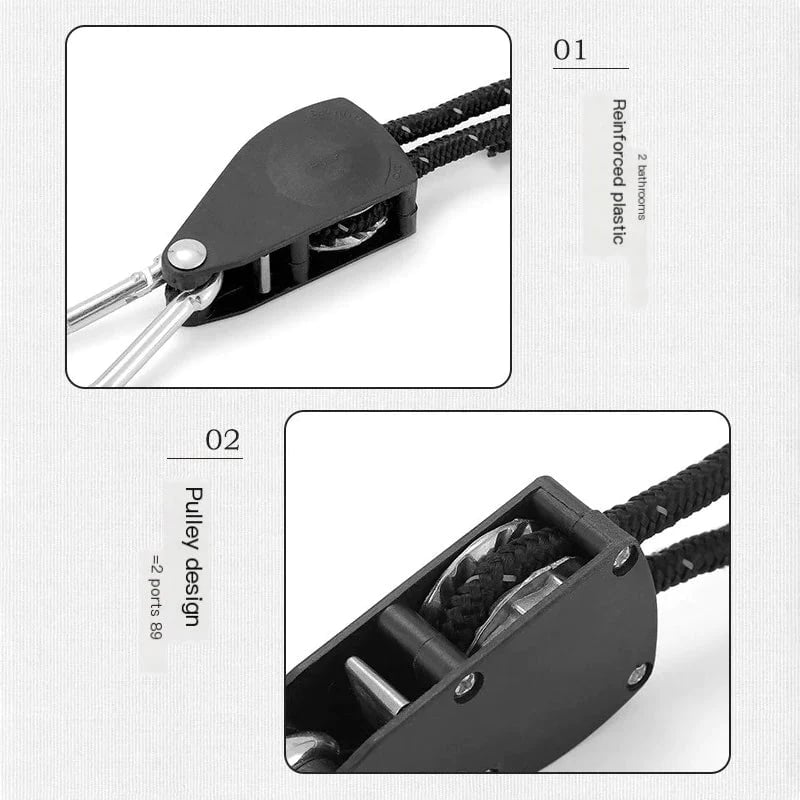 🌳 ПО-ЛЕСНО И БЪРЗО КЪМПИНГУВАНЕ: Просто закачете хамак, покривало на палатка или колчета за палатки към карабините и след това настройте дължината на въжето с блока, което намалява времето за инсталиране и елиминира бавните възли.