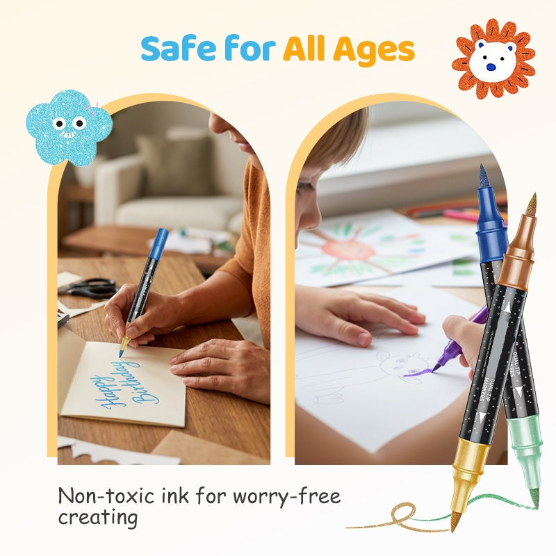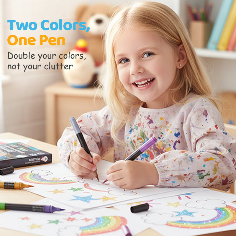 🖊️ ДВА ЦВЯТА В ЕДИН МАРКЕР – Всеки маркер съдържа два различни цвята, удвоявайки палитрата ви без допълнителен хаос. Лесно преминавайте между допълващи се нюанси за динамични и слоеви творби.